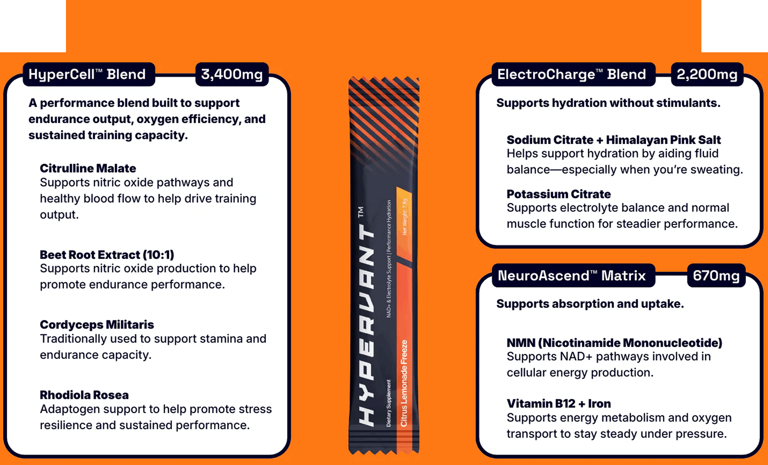 Hypervant Oxygen isn’t built around one ingredient or one effect. It’s designed to support endurance by addressing the main reasons athletes feel wired during training and wiped out afterward.